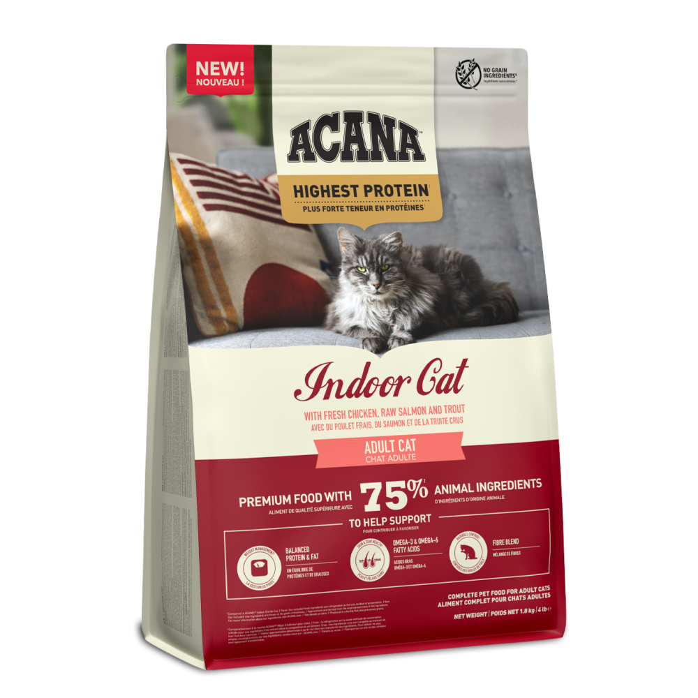 Acana Highest Protein Indoor Cat è una ricetta senza cereali aggiunti, pensata per gatti domestici! Ricca di pollo allevato a terra, trota e salmone, questa ricetta premium è realizzata con il 75% di ingredienti di origine animale per soddisfare il desiderio del tuo gatto di avere più proteine.