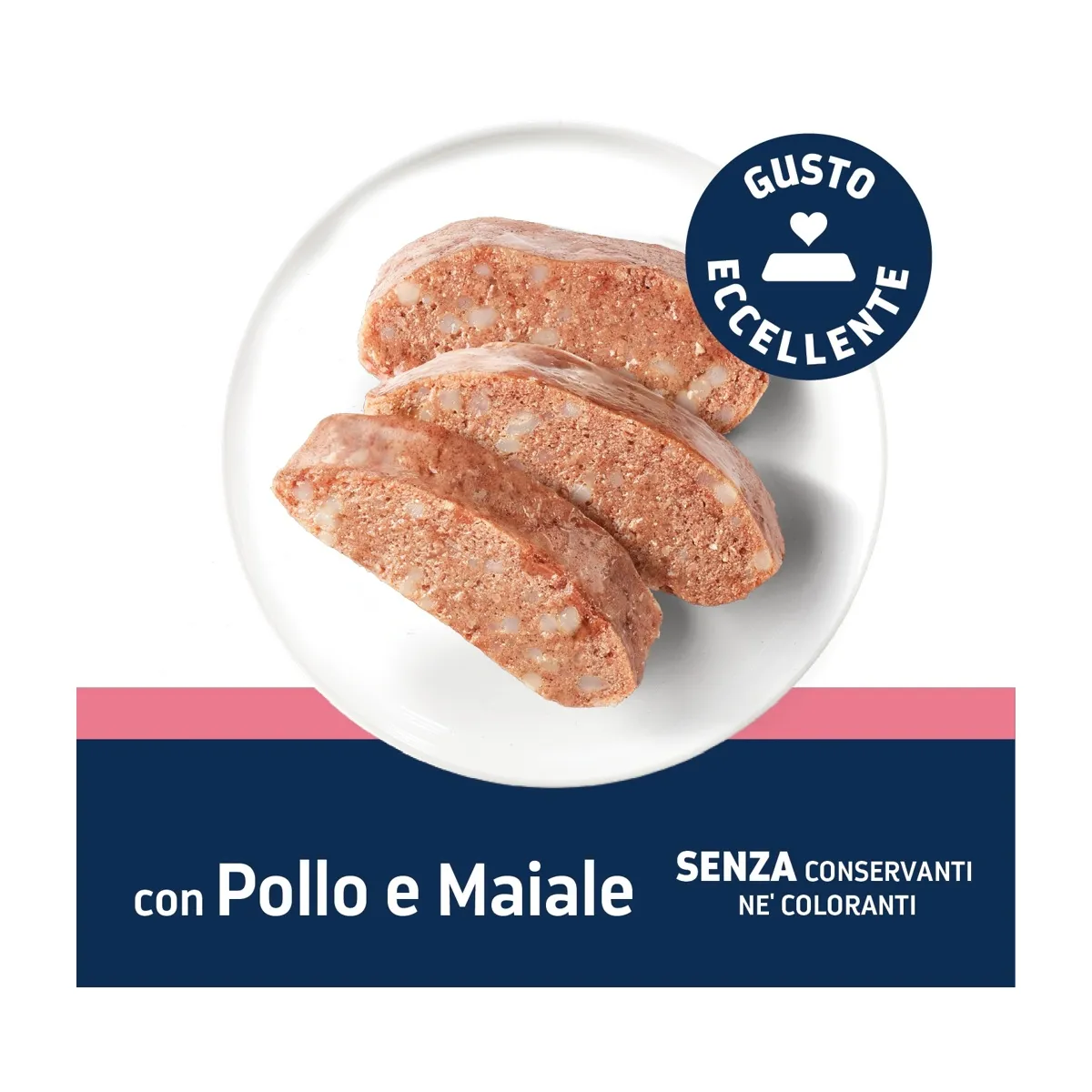 Carne e sottoprodotti animali (pollo 19%, maiale 14%) sottoprodotti di origine vegetale (inulina di cicoria 0,1%) oli e grassi sostanze minerali estratti di proteine vegetali zuccheri. Fonti proteiche: pollo, maiale.