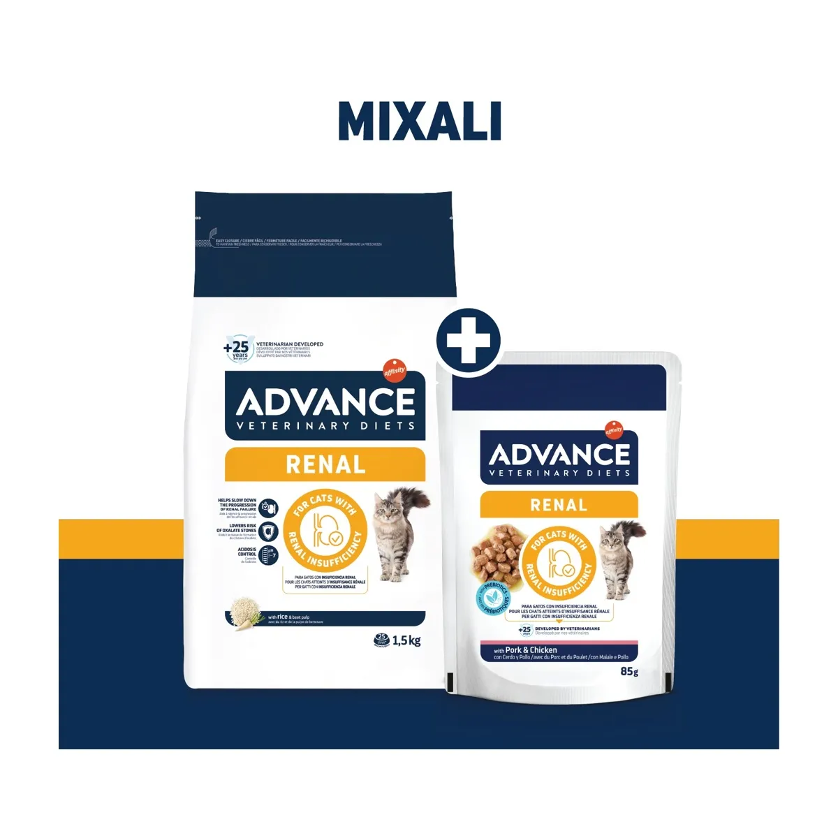 ADVANCE VETERINARY DIETS FELINE RENAL è un alimento dietetico completo per gatti adulti, con un contenuto proteico limitato ma di alta qualità e un basso contenuto di fosforo, indicato per sostenere la funzione renale in caso di insufficienza renale cronica o transitoria. Vantaggi OLIO DI PESCE RICCO DI Ω-3: aiuta a controllare l'ipertensione glomerulare e a prevenire i danni strutturali ai reni. PH NEUTRO: aiuta a prevenire la formazione di calcoli di ossalato. BASSO IN FOSFORO: contribuisce a rallentare la progressione dell'insufficienza renale. LIVELLO MODERATO DI PROTEINE: facilita la funzione renale e il mantenimento dei muscoli.