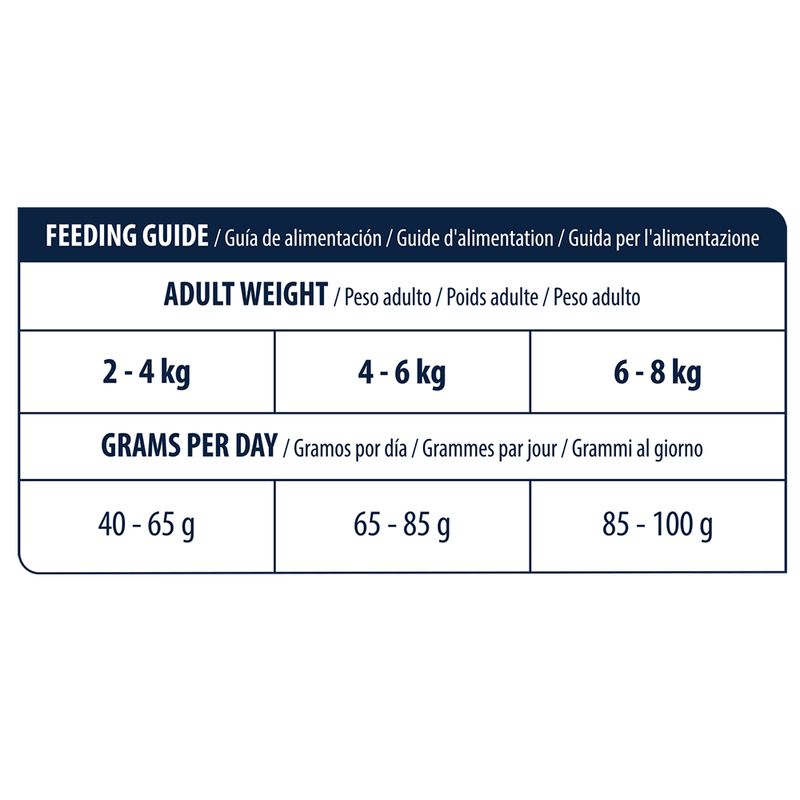 Amido di mais purificato, Proteina di soia idrolizzata, Strutto, Proteine animali idrolizzate, Cellulosa, Olio di pesce, Fosfato monocalcico, Cloruro di potassio, Solfato di calcio, Olio di soia, Carbonato di calcio, Fruttoligosaccaridi, Sale, Citrato di potassio, Ossido di magnesio, Fonte di proteine: Proteina di soia idrolizzata, Fonte di carboidrati: Amido di mais purificato.