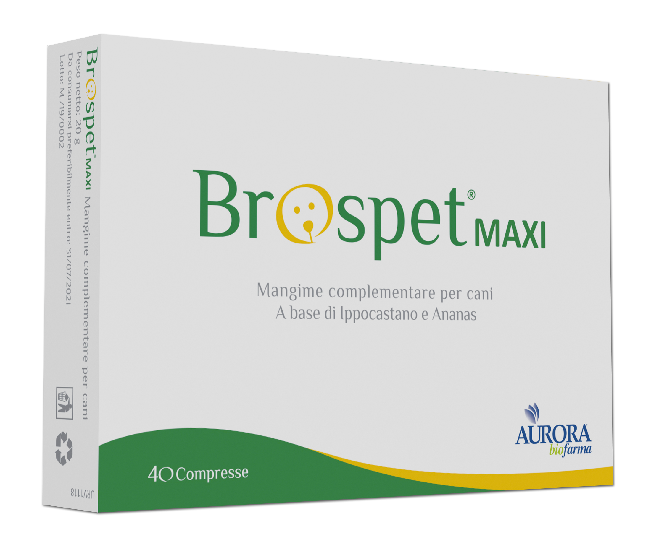 Aurora biofarma brospet maxi 40 compresse è un mangime complementare per cani a base di Maltodestrine fermen tate da Aspergillus, Lppocastano e Ananas. Contribuisce al drenaggio dei liquidi interstiziali.