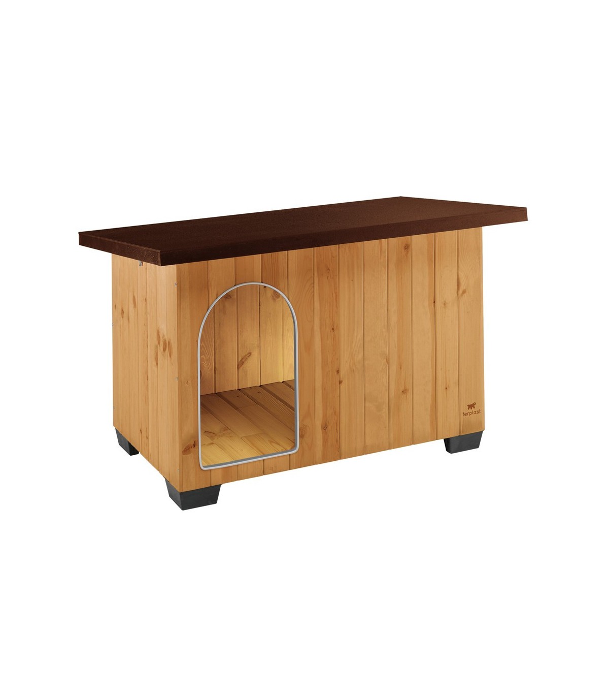 Baitaè dotata di piedini in plastica che consentono di mantenerla perfettamente isolata dal terreno. La porta d'ingresso della cuccia, posta lateralmente per una maggiore protezione dagli agenti atmosferici, presenta un particolare rivestimento antimorso in alluminio. Un apposito gancio in metallo assicura il fissaggio del tetto alla cuccia e consentendone al tempo stesso l'apertura per le operazioni di manutenzione quotidiana.