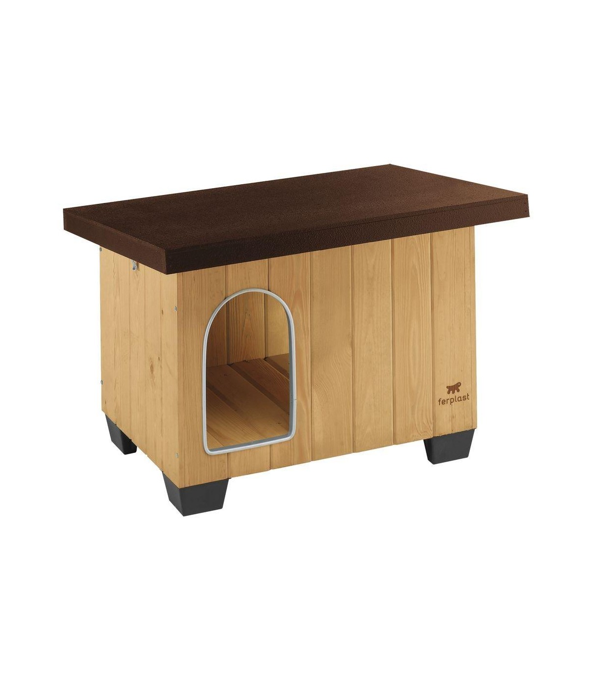 Baitaè dotata di piedini in plastica che consentono di mantenerla perfettamente isolata dal terreno. La porta d'ingresso della cuccia, posta lateralmente per una maggiore protezione dagli agenti atmosferici, presenta un particolare rivestimento antimorso in alluminio. Un apposito gancio in metallo assicura il fissaggio del tetto alla cuccia e consentendone al tempo stesso l'apertura per le operazioni di manutenzione quotidiana.