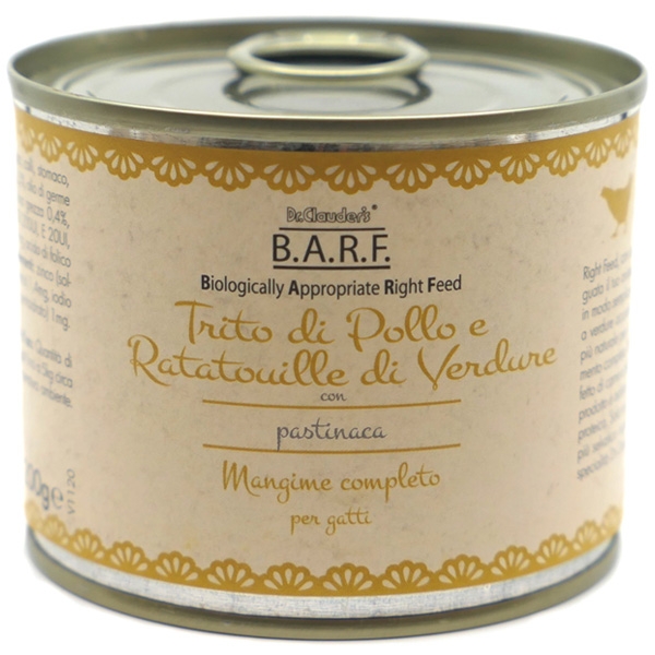 Dr. Clauder‘s alimento completo Trito di Pollo e Ratatouille di verdure, è preparato con una cottura a vapore per preservare le caratteristiche nutritive di tutti gli ingredienti. È un insieme perfetto di carne e frattaglie 100% da pollo, con pastinaca e oli. Questo prodotto è adatto anche a gatti sensibili grazie alla sua formula mono proteica. Questo alimento completo è formulato rispettando le peculiarità digestive del gatto.