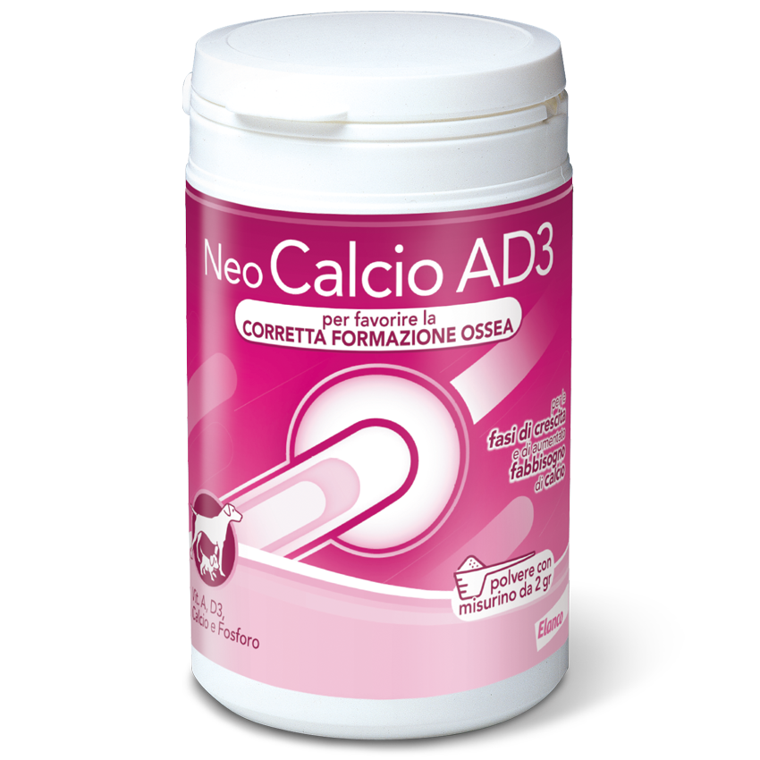 Neo Calcio AD3 è un mangime complementare per cuccioli e cani adulti per favorire la corretta formazione ossea nella fase di crescita e assicura ai cuccioli la quantità di calcio di cui hanno bisogno. È un integratore per cani indicato inoltre per arricchire la dieta in tutti i casi di aumentato fabbisogno di calcio, ad esempio cagne in gravidanza e in lattazione, oppure cani alimentati con una dieta casalinga.