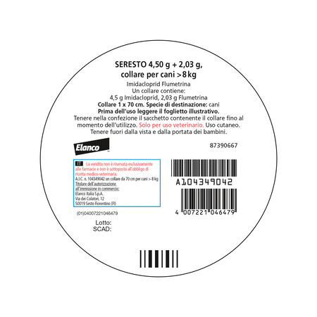 - Seresto 4,50 g + 2,03 g da 70 cm (45 g): collare per cani di taglia grande oltre gli 8 kg di peso corporeo.