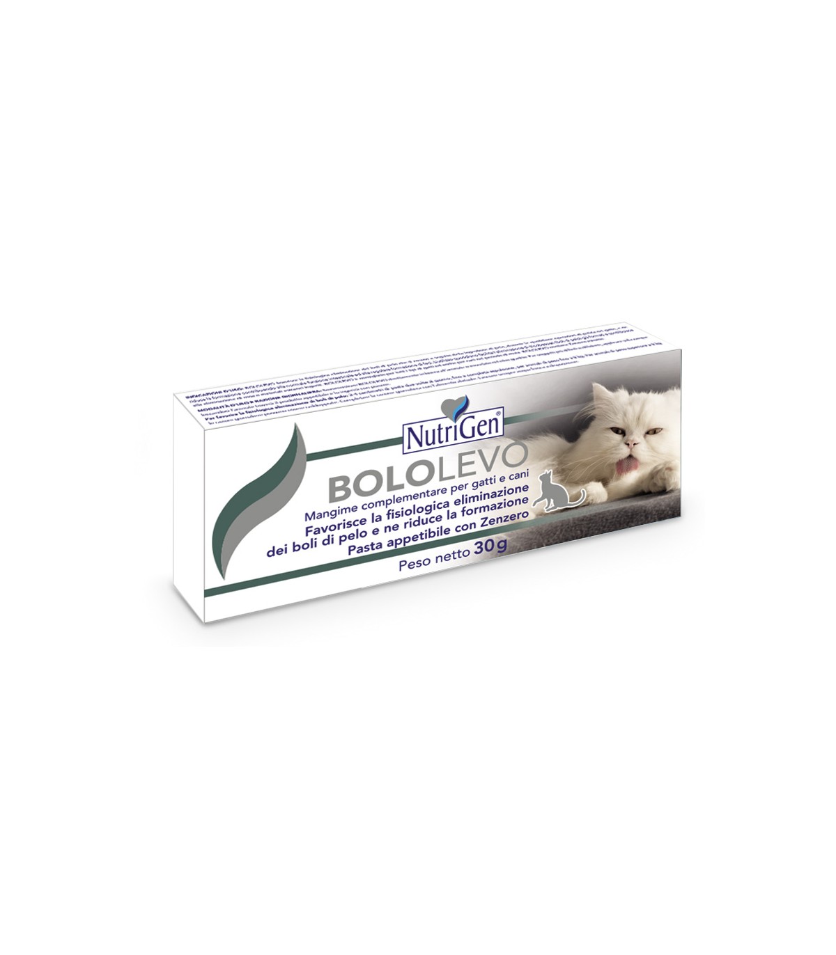 Bololevo previene la formazione dei boli che si creano a seguito della ingestione di pelo e che creano costipazione anche grave, difficoltà digestive e stati irritativi del tratto grastro intestinale. Agli opportuni dosaggi facilita l'eliminazione dei Tricobezoari (boli di pelo) già formati e può coadiuvare l'eliminazione di piccole parti di ossa o di materiali estranei ingeriti. Bololevoè consigliato per tutti i tipi di gatti nel periodo di muta. Può essere utilizzato anche a seguito di ridotta attività motoria. La presenza nella formula di gel di Aloe Vera contribuisce a lenire i tratti digestivi ed a proteggere la mucosa intestinale, lo zenzero facilita la digestione ed ha proprietà antinfiammatorie.
