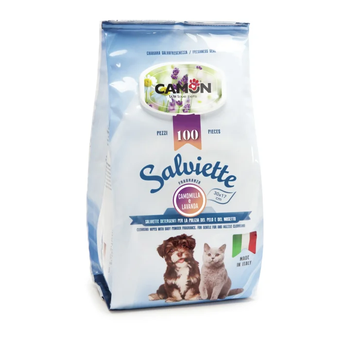 Salviette detergenti per la pulizia del pelo e del musetto, al profumo di Camomilla e Lavanda, nel maxi formato da 100 pezzi.