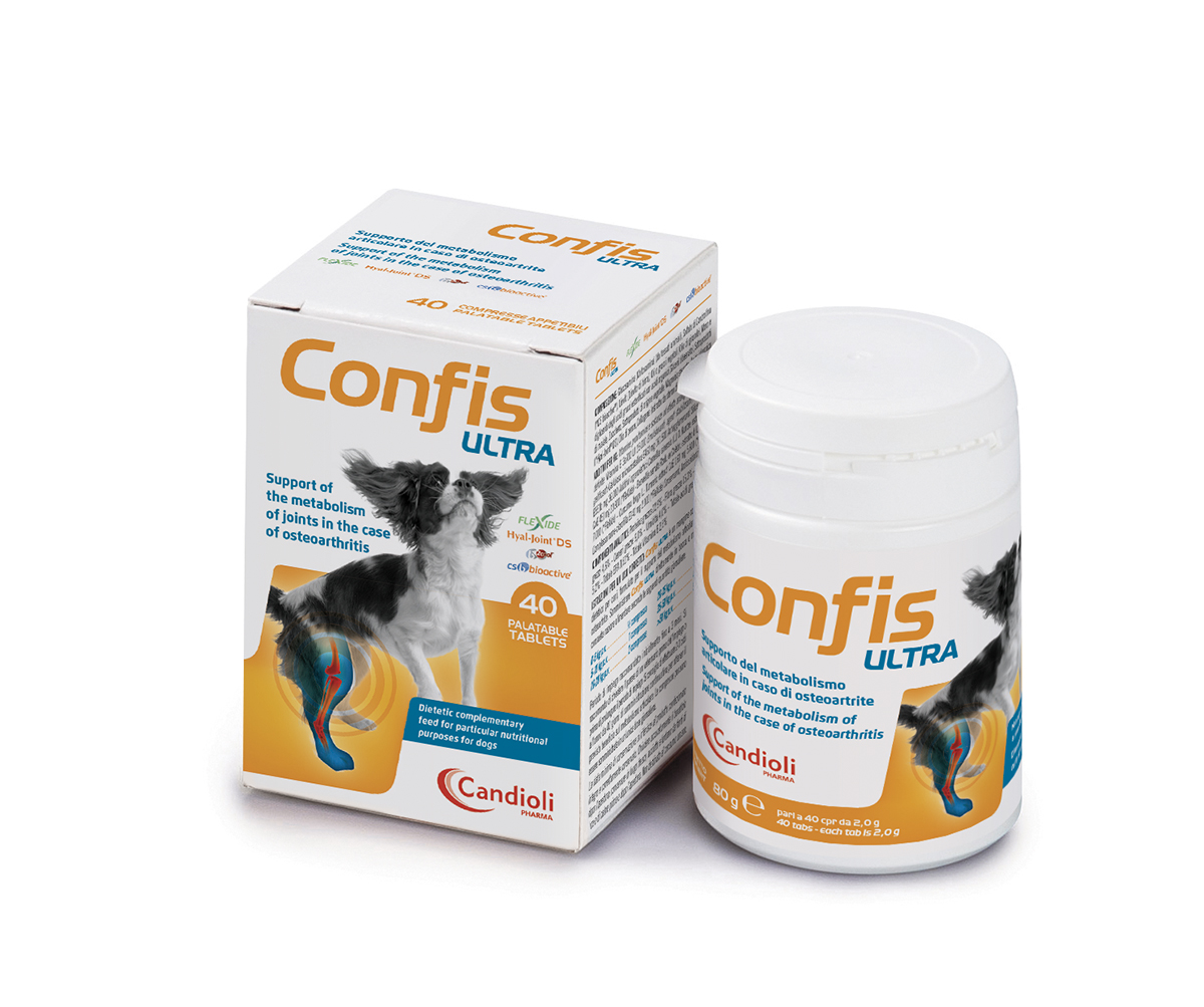 Confis Ultra ? un mangime complementare dietetico per cani, formulato per il supporto del metabolismo articolare in caso di osteoartrite.