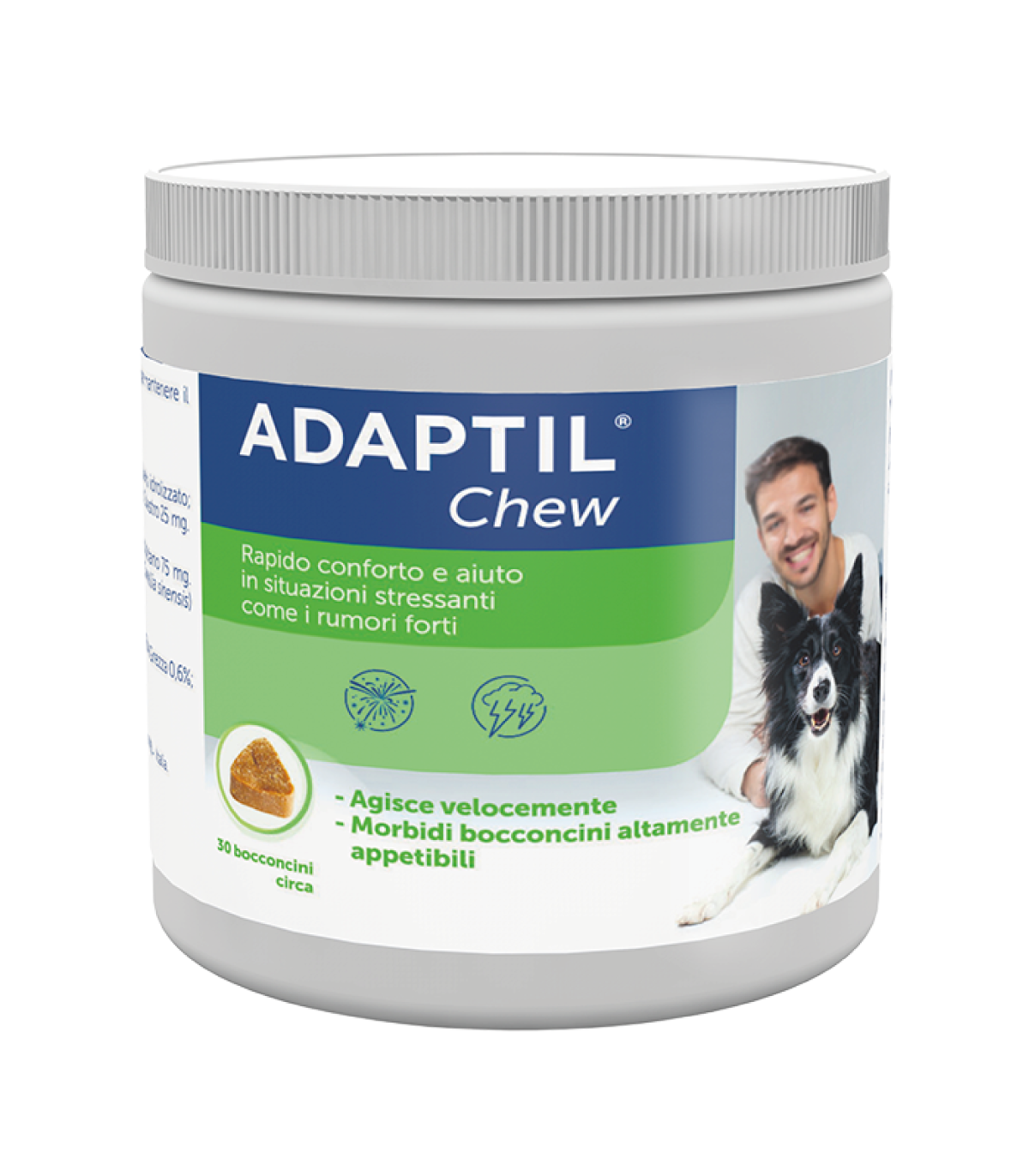 ADAPTIL Chew, snack altamente appetibile in bocconcini che dona rapido conforto e aiuto per il cane in situazioni di stress (rumori forti: fuochi d'artificio, temporali, visitatori, trasporto in auto, visite dal veterinario, sessioni di toelettatura, esposizione canina, ecc, etc.)