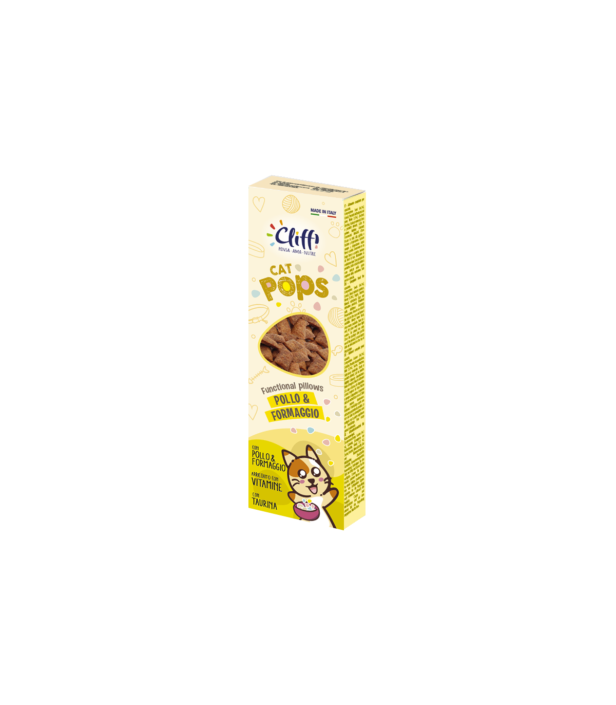 CLIFFI CAT POPS – POLLO E FORMAGGIO sono premietti croccanti fuori e morbidi dentro, altamente appetibili, con pollo e formaggio. Nella loro preparazione non vengono aggiunti conservanti e aromi artificiali. È la ricompensa ideale tra i pasti. Confezionato in atmosfera protettiva.