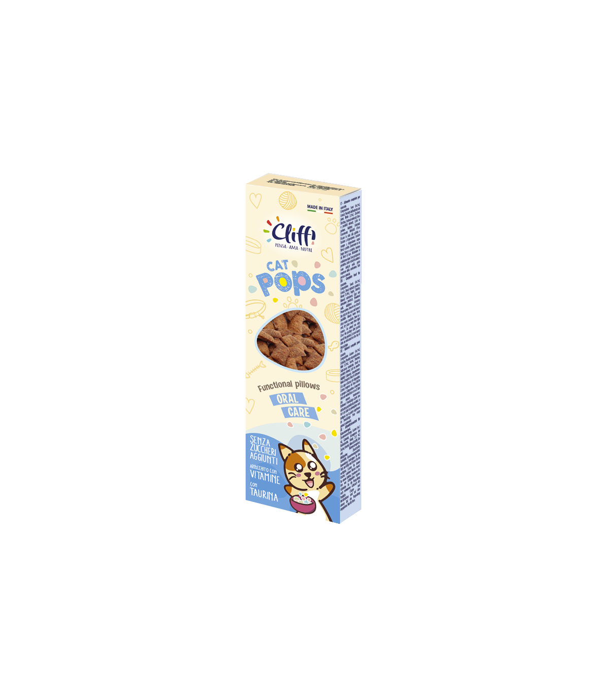 CLIFFI CAT POPS – ORAL CARE sono premietti croccanti fuori e morbidi dentro, altamente appetibili. La formula Oral care è realizzata con ingredienti funzionali utili al mantenimento di un alito fresco e della salute del cavo orale. Nella sua preparazione non vengono aggiunti zuccheri, coloranti, conservanti e aromi artificiali. È la ricompensa ideale tra i pasti. Confezionato in atmosfera protettiva.