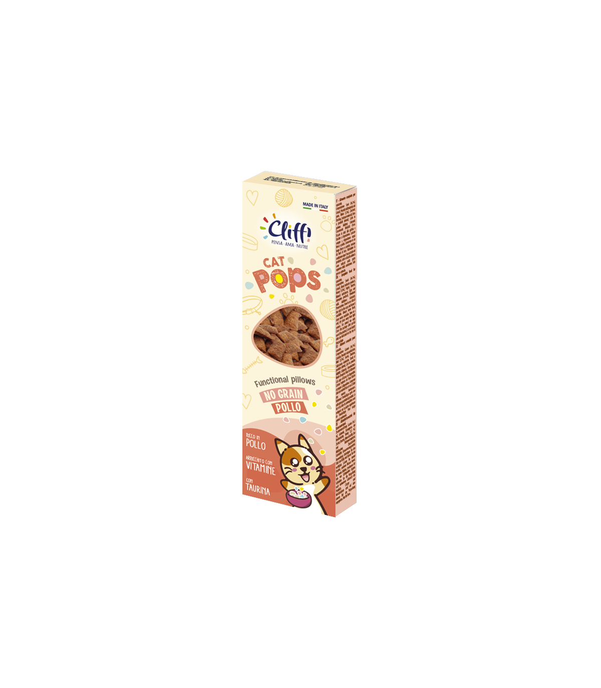 CLIFFI CAT POPS – NO GRAIN sono premietti croccanti fuori e morbidi dentro, altamente appetibili. La formula No grain è realizzata senza l’aggiunta di frumento, ma ricca in pollo. Nella sua preparazione non vengono aggiunti conservanti e aromi artificiali. È la ricompensa ideale tra i pasti. Confezionato in atmosfera protettiva.