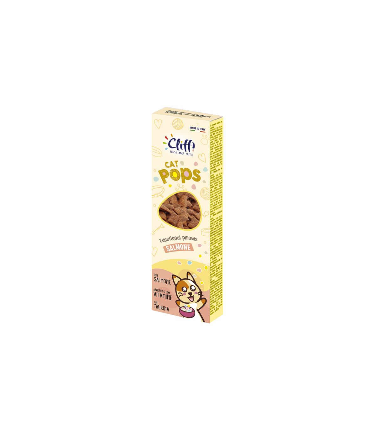 CLIFFI CAT POPS – SALMONE sono premietti croccanti fuori e morbidi dentro, altamente appetibili, con salmone. Nella loro preparazione non vengono aggiunti conservanti e aromi artificiali. È la ricompensa ideale tra i pasti. Confezionato in atmosfera protettiva.