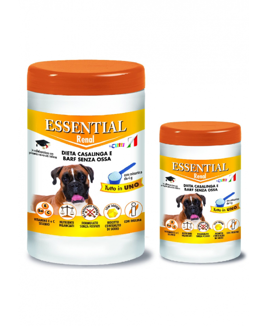 Caratteristiche: ESSENTIAL Cane Renal è l'alimento complementare, essenziale per l'integrazione della dieta casalinga, a eliminazione, o BARF senza ossa del cane adulto, ideale per favorirne la corretta funzionalità renale (che necessiti di un sostegno della funzionalità renale). La vitamina E, la vitamina C e il selenio contrastano lo stress ossidativo grazie alla loro funzione antiossidante. L'inulina, riducendo l'assorbimento di scorie azotate dall' intestino, è utile per migliorare il controllo dell'azotemia. Formulato senza fosforo, con limitato apporto di sodio, e con citrato di potassio, favorisce il mantenimento di un corretto equilibrio elettrolitico,acido-basico e delle normali condizioni metaboliche. Contiene vitamine, macroelementi e oligoelementi minerali, normalmente carenti nelle diete casalinghe. I nutrienti antiossidanti supportano il sistema immunitario; il corretto apporto di calcio e di vitamina D contribuisce al benessere dell'apparato scheletrico, evitando i rischi di carenze o di possibili eccessi. Ad elevata tollerabilità, poiché è formulato senza fonti proteiche aggiunte