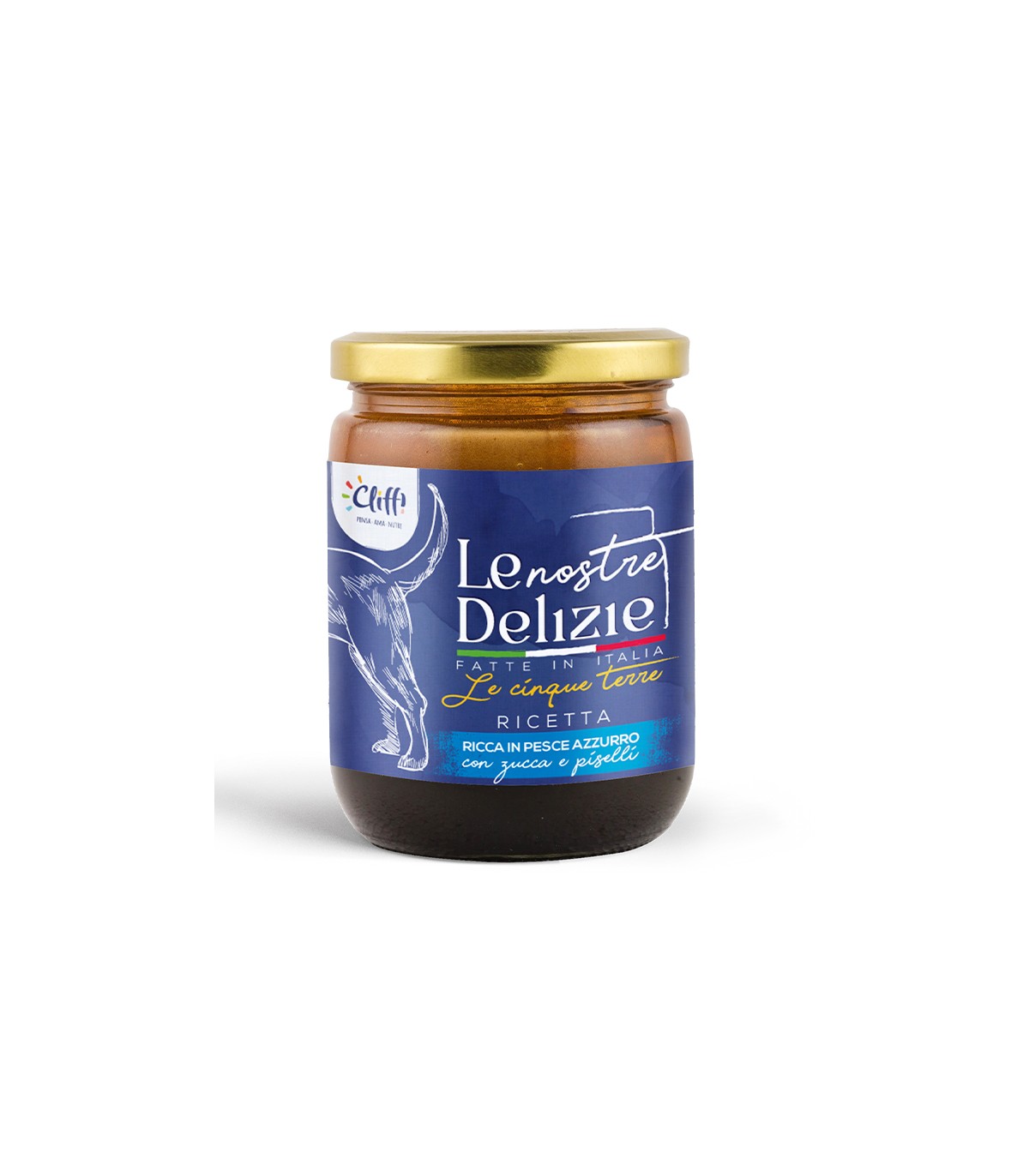 Le Nostre Delizie Cinque Terre è un alimento completo per cani ricco in pesce azzurro, con zucca e piselli. È adatto a tutti i tipi di cane poiché formulato con pesce e senza cereali aggiunti. Contiene verdure e frutta, fonte naturale di fibre per il mantenimento del benessere intestinale del pet.