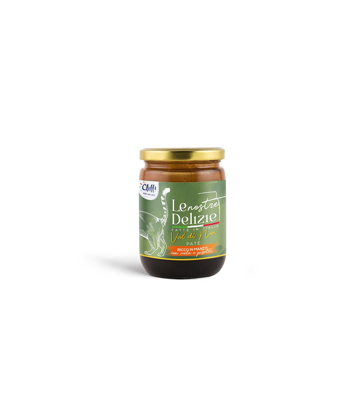 Le Nostre Delizie Val di Non è un alimento completo in patè per gatti ricco in manzo, con mela e piselli. È adatto a tutti i tipi di gatto ed è formulato senza cereali aggiunti. Contiene mela, carote e piselli fonte naturale di fibre per il mantenimento del benessere intestinale del pet.