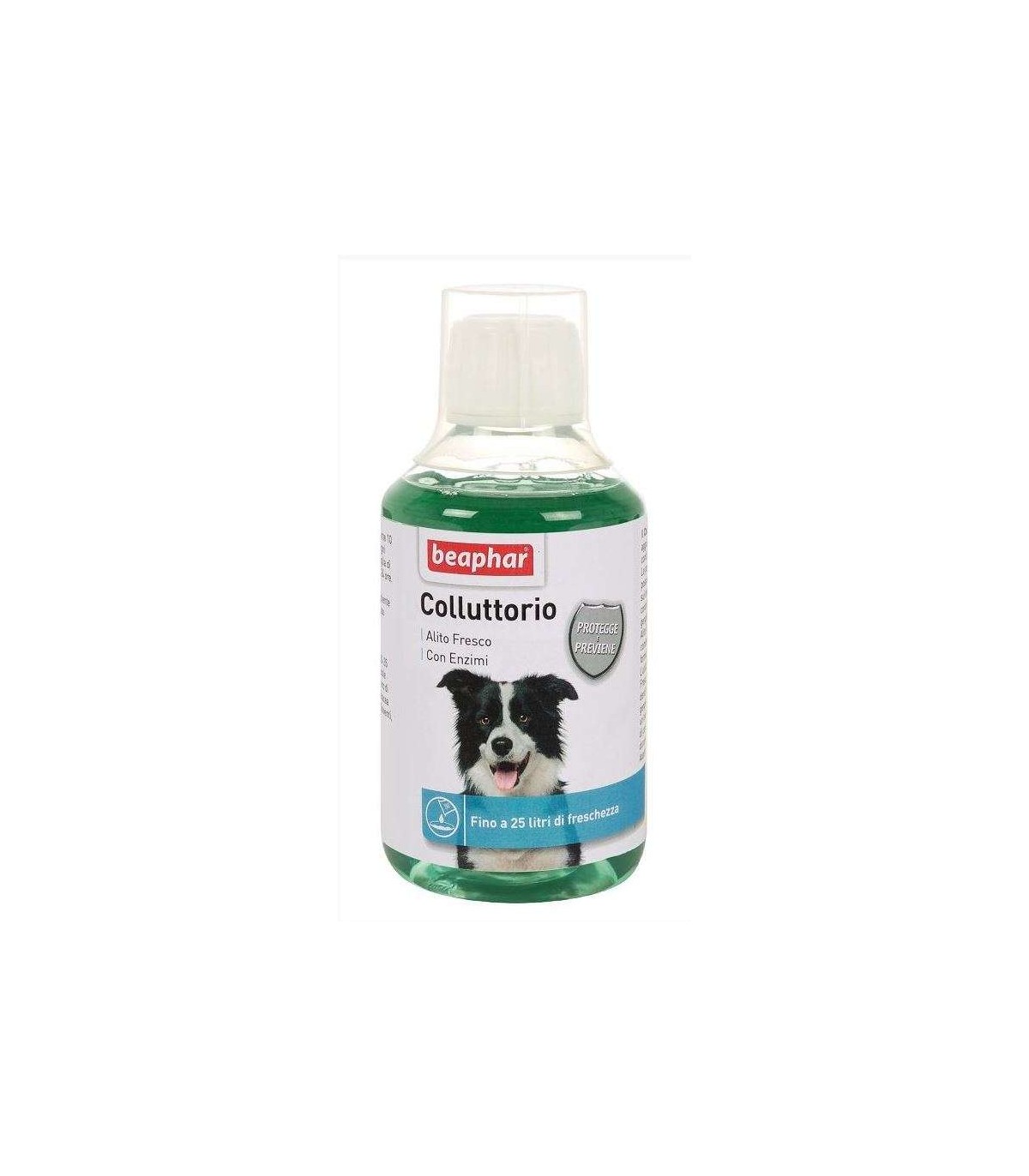 Beaphar colluttorio Alito Fresco 250 ml viene aggiunto all'acqua da bere del cane per contrastare l'alito cattivo. Le particelle di cibo ed i batteri dannosi possono causare la formazione della placca sui denti, che allo stesso tempo può contribuire allo sviluppo di carie e malattie gengivali causando l'alito cattivo. Il Collutorio Alito Fresco Beaphar contiene enzimi che combattono i batteri dannosi e riducono la formazione della placca. L'utilizzo quotidiano del Collutorio Alito Fresco Beaphar contribuisce a mantenere i denti forti e in salute, rafforzando anche le gengive.