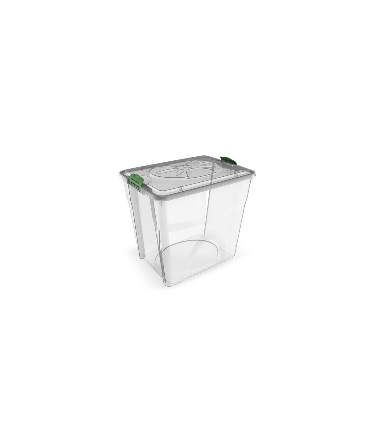 Pratico contenitore in plastica sovrapponibile, dotato di un sistema di chiusura che consente sia la completa rimozione del coperchio che l' apertura a cerniera.
