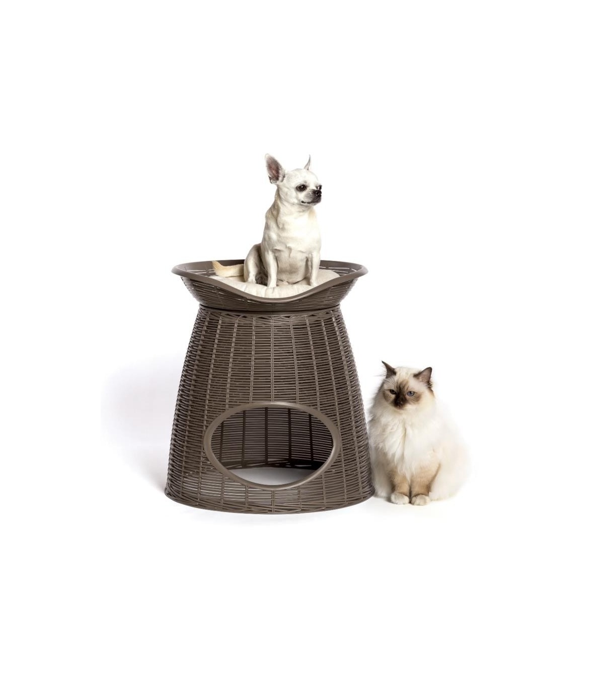 Cuccia per gatti e cani di piccola taglia dal design simil paglia che in un attimo può trasformarsi in comoda seduta. Ideale sia per i gatti che amano dormire in alto che per quelli che preferiscono nascondersi.