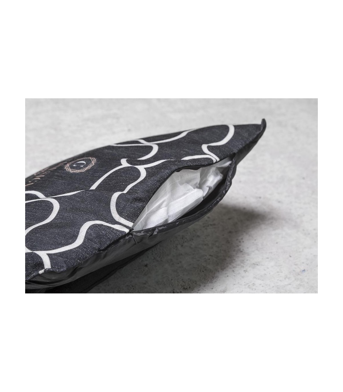 Il cuscinoè completamente lavabile e sfoderabile, e double faces: un latoè in misto cotone stampato ed un latoè in poliestere lavabile, ideale per i momenti in cui il caneè più bagnato o sporco. Il cuscinoè disponibile a scelta in due diverse fantasie, nei colori grigio o nero.