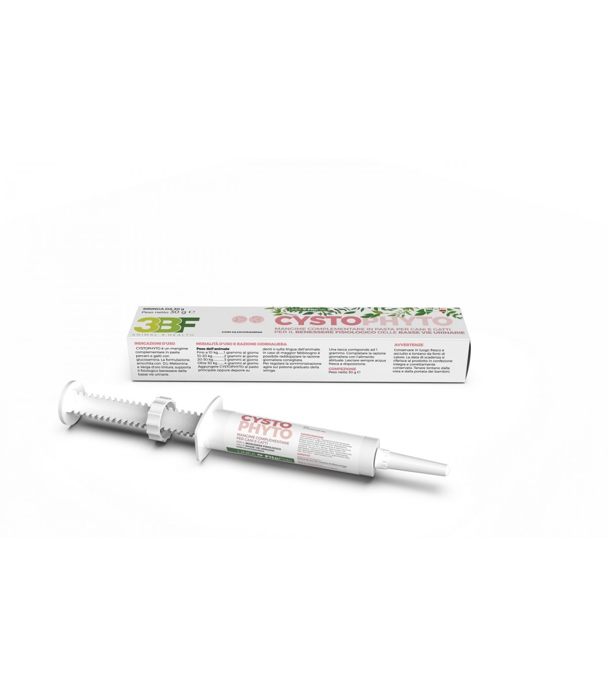 Aggiungere CYSTOPHYTO al pasto principale oppure deporre su denti o sulla lingua dell'animale. Utilizzare per 1-2 settimane. Su consiglio medico veterinario, per i primi 7 giorni,è possibile raddoppiare la razione giornaliera consigliata, suddividendo le somministrazioni con un intervallo di 12 ore, per poi proseguire con la normale razione giornaliera nei giorni successivi. Per regolare il dosaggio agire sul pistone graduato della siringa. Una tacca corrisponde ad 1 grammo. Completare la razione giornaliera con l'alimento abituale. Lasciare sempre acqua fresca a disposizione. Consultare un medico veterinario prima dell'impiego.