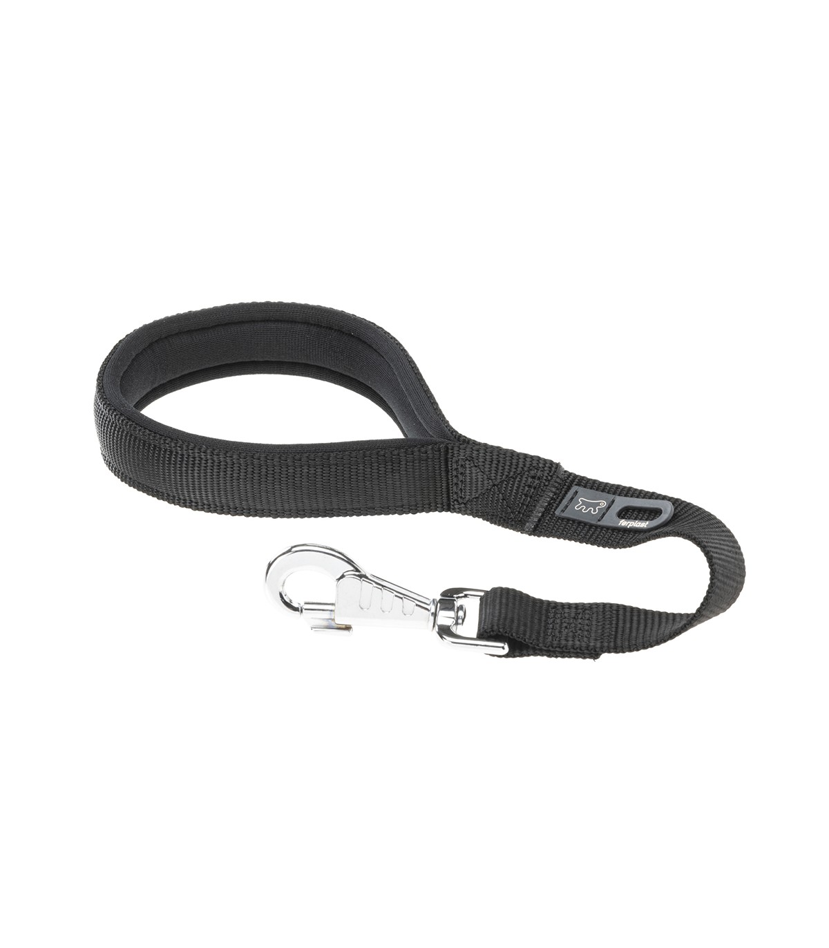 Guinzaglio corto in nylon con impugnatura imbottita e porta sacchetti igienici integrato
