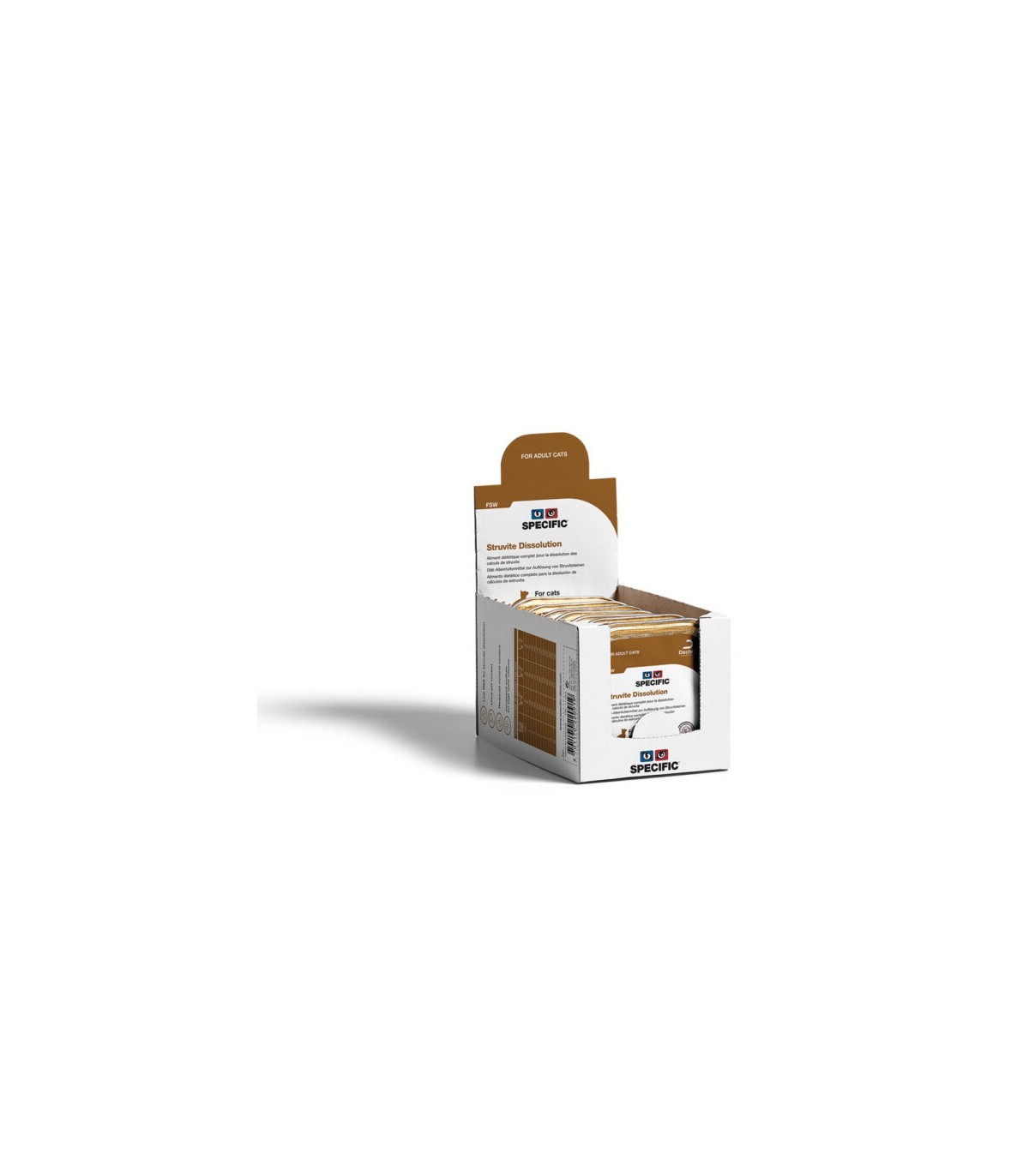 - Dopo la dissoluzione degli uroliti da struvite (di solito dopo circa 1-2 mesi), la dieta deve essere sostituita con SPECIFIC® FCD/FCW o FCD-L Crystal Management Light per ridurre le recidive.