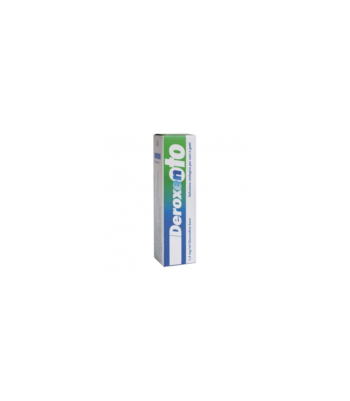 INDICAZIONI: Per il lavaggio e l'antisepsi delle orecchie nelle otiti sostenute da batteri Gram positivi, Gram negativi e Malassezie, sensibili alla Clorexidina. In particolare la concentrazione di 1,5 mg/ml di Clorexidina base del Deroxen oto risulta efficace entro 15 minuti nei confronti dei seguenti germi: Pseudomonas aeruginosa; Staphylococcus aureus; Staphylococcus epidermidis; Staphylococcus intermedius, Enterobacter cloacae; Providencia alcalifaciens; Malassezia pachydermatis. La concentrazione di Clorexidina utilizzata non risulta ototossica anche in presenza di perforazione del timpano.