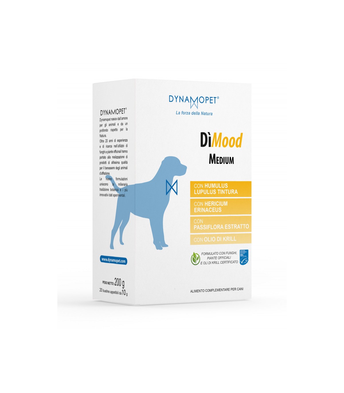 DìMood aiuta il cane a superare momenti di tensione e nervosismo; utile durante i viaggi e per ridurre la paura dei fuochi d'artificio.
