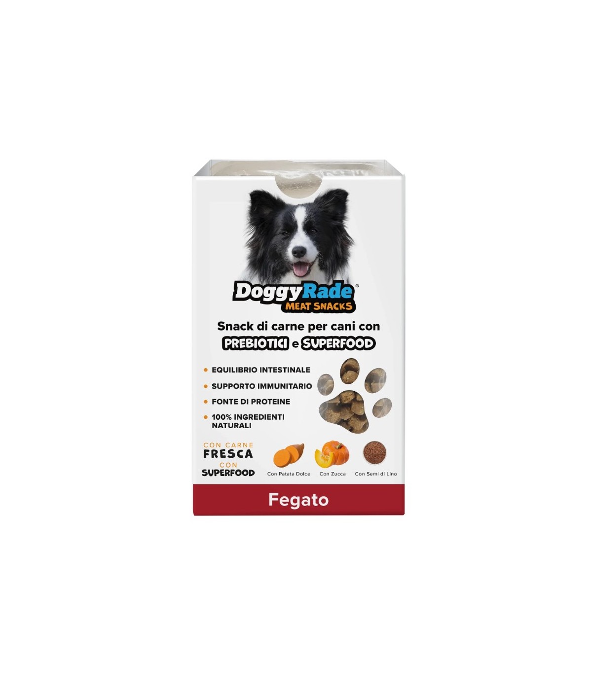 Doggyrade Meat Snacks - con Prebiotici e Superfood sono snack di carne semiumidi per cani. Realizzati con carne fresca e ingredienti naturali al 100%, questi gustosi snack funzionali contengono prebiotici e superfood, tra cui patata dolce, zucca e semi di lino.