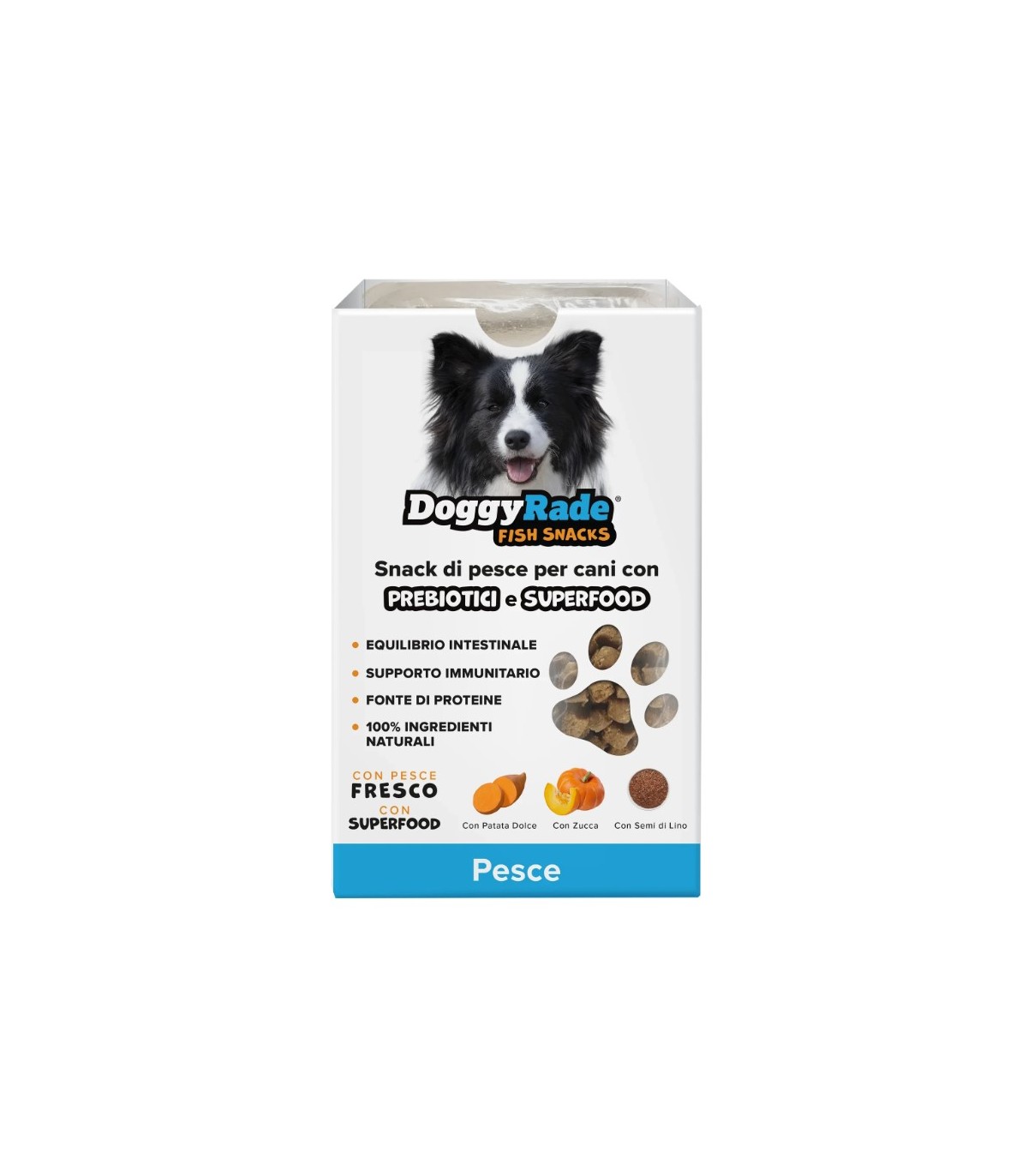 Doggyrade Meat Snacks - con Prebiotici e Superfood sono snack di carne semiumidi per cani. Realizzati con carne fresca e ingredienti naturali al 100%, questi gustosi snack funzionali contengono prebiotici e superfood, tra cui patata dolce, zucca e semi di lino.