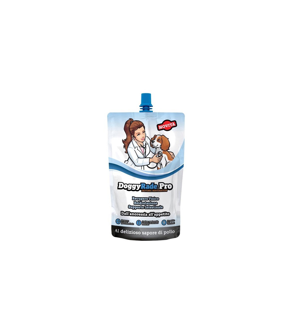 DoggyRade Proè classificato come alimento dietetico complementare per i cani di età superiore a 6 settimane. Mangime utile nei casi di riduzione dei disturbi acuti dell'assorbimento intestinale. Una rinfrescante bevanda isotonica energizzante, al gustoso sapore di pollo che i cani adorano.