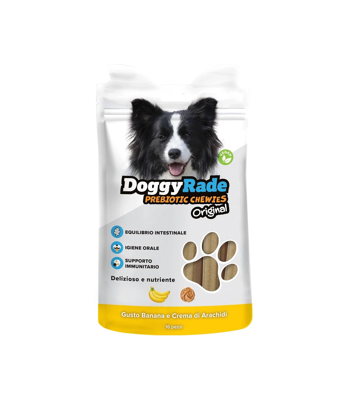 DoggyRade Prebiotic Chewies sono gustosi stick prebiotici che oltre a promuovere al’igiene orale supportano l’equilibrio intestinale del cane e il suo sistema immunitario (3 in 1). Questi stick di lunga durata contengono prebiotici di fibre naturali che favoriscono la crescita di batteri benefici nell’intestino.