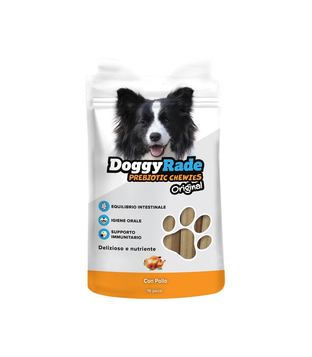 DoggyRade Prebiotic Chewies sono gustosi stick prebiotici che oltre a promuovere al’igiene orale supportano l’equilibrio intestinale del cane e il suo sistema immunitario (3 in 1). Questi stick di lunga durata contengono prebiotici di fibre naturali che favoriscono la crescita di batteri benefici nell’intestino.