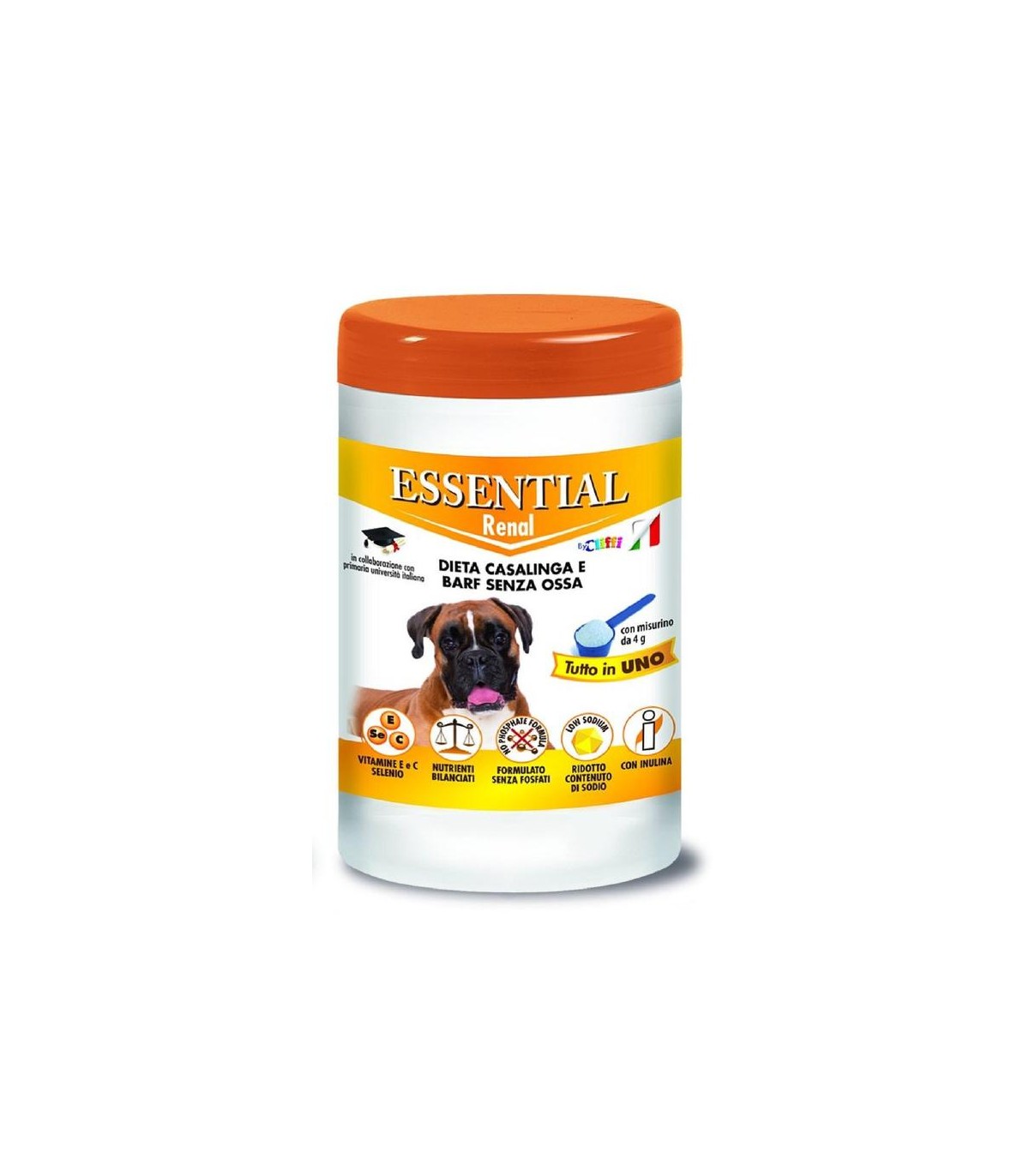 Caratteristiche: ESSENTIAL Cane Renal è l'alimento complementare, essenziale per l'integrazione della dieta casalinga, a eliminazione, o BARF senza ossa del cane adulto, ideale per favorirne la corretta funzionalità renale (che necessiti di un sostegno della funzionalità renale). La vitamina E, la vitamina C e il selenio contrastano lo stress ossidativo grazie alla loro funzione antiossidante. L'inulina, riducendo l'assorbimento di scorie azotate dall'intestino,è utile per migliorare il controllo dell'azotemia. Formulato senza fosforo, con limitato apporto di sodio, e con citrato di potassio, favorisce il mantenimento di un corretto equilibrio elettrolitico,acido-basico e delle normali condizioni metaboliche. Contiene vitamine, macroelementi e oligoelementi minerali, normalmente carenti nelle diete casalinghe. I nutrienti antiossidanti supportano il sistema immunitario; il corretto apporto di calcio e di vitamina D contribuisce al benessere dell'apparato scheletrico, evitando i rischi di carenze o di possibili eccessi. Ad elevata tollerabilità, poichéè formulato senza fonti proteiche aggiunte