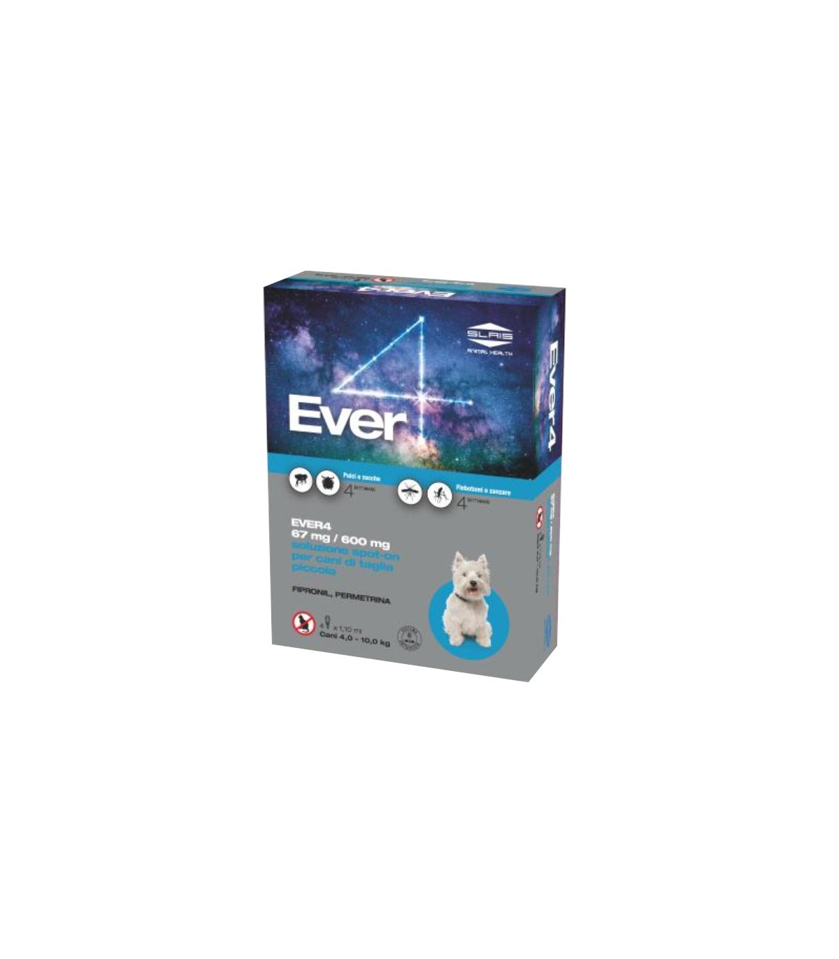 Ever 4è un medicinale veterinario a base del principio attivo Fipronil + Permetrina, appartenente alla categoria degli Antiparassitari e nello specifico Altri ectoparassiticidi per uso topico. E' commercializzato in Italia dall'azienda Slais S.r.l..