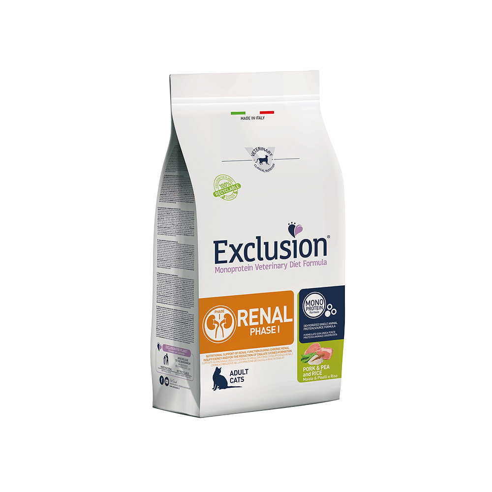 Exclusion Monoprotein Veterinary Diet Formula Renal è un alimento dietetico con formulazione monoproteica, realizzato con un’unica fonte alternativa di proteine animali, ingredienti innovativi e preservato con tocoferoli naturali; rappresenta la risposta nutrizionale a disposizione del Veterinario, come supporto nutrizionale specifico in corso di insufficienza renale cronica e per la riduzione della formazione dei calcoli a base di ossalati nei gatti.