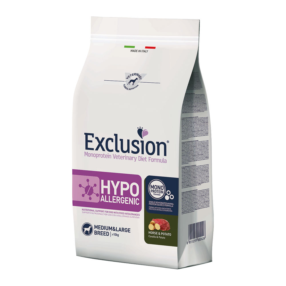 Le crocchette per cani Exclusion con Cavallo & Patate sono un alimento dietetico bilanciato per cani adulti che presentano intolleranze a ingredienti e nutrienti e da somministrare a scopo di desensibilizzazione. Contengono carne di cavallo come unica fonte di proteina animale e patate come fonte di carboidrati. Non contengono prodotti alimentari
