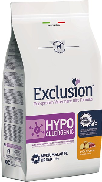 La maggior parte dei regimi alimentari destinati al trattamento di intolleranze o allegie alimentari non sono molto gustosi e pertanto causano una perdita di peso nell' animale. Le crocchette Exclusion hanno un sapore molto appetitoso e consentono di migliorare lo stato di salute del vostro cane grazie ad una fomulazione speciale controllata da veterinari e all' alta qualità degli ingredienti. Le crocchette Exclusion possono essere utilizzate come alimentazione completa per un periodo di tempo illimitato; inoltre il vostro cane non avrà bisogno di tempo per abituarsi alla nuova dieta. Vi consigliamo tuttavia di consultare il veterinario prima di procedere alla somministrazione del presente alimento.