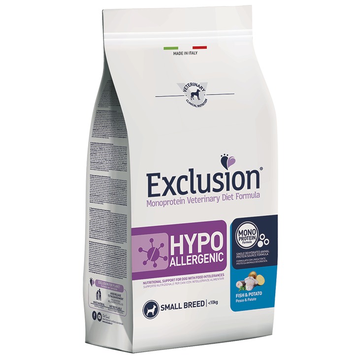 Caratteristiche: Exclusion Diet Hypoallergenic Fish and Potato Small Breed è un alimento completo dietetico per cani adulti formulato per la riduzione di intolleranze a ingredienti e a sostanze nutritive. Questo alimento completo dietetico possiede fonti selezionate di proteine e carboidrati.