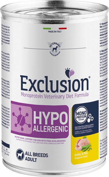 Exclusion Monoprotein Veterinary Diet Formula Hypoallergenic è un alimento dietetico con formulazione monoproteica, realizzato con un’unica fonte alternativa di proteine animali, ingredienti innovativi e preservato con tocoferoli naturali; rappresenta la risposta nutrizionale a disposizione del Veterinario, differenziata per taglia, come supporto nutrizionale per cani con intolleranze alimentari.