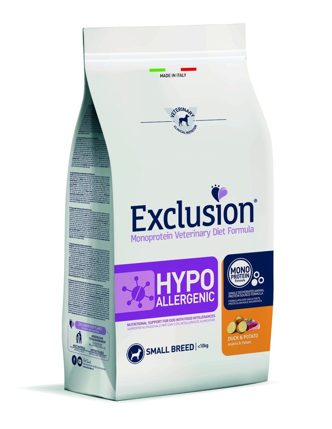 Exclusion Monoprotein Veterinary Diet Formula Hypoallergenic è un alimento dietetico con formulazione monoproteica, realizzato con un’unica fonte alternativa di proteine animali, ingredienti innovativi e preservato con tocoferoli naturali; rappresenta la risposta nutrizionale a disposizione del Veterinario, differenziata per taglia, come supporto nutrizionale per cani con intolleranze alimentari.