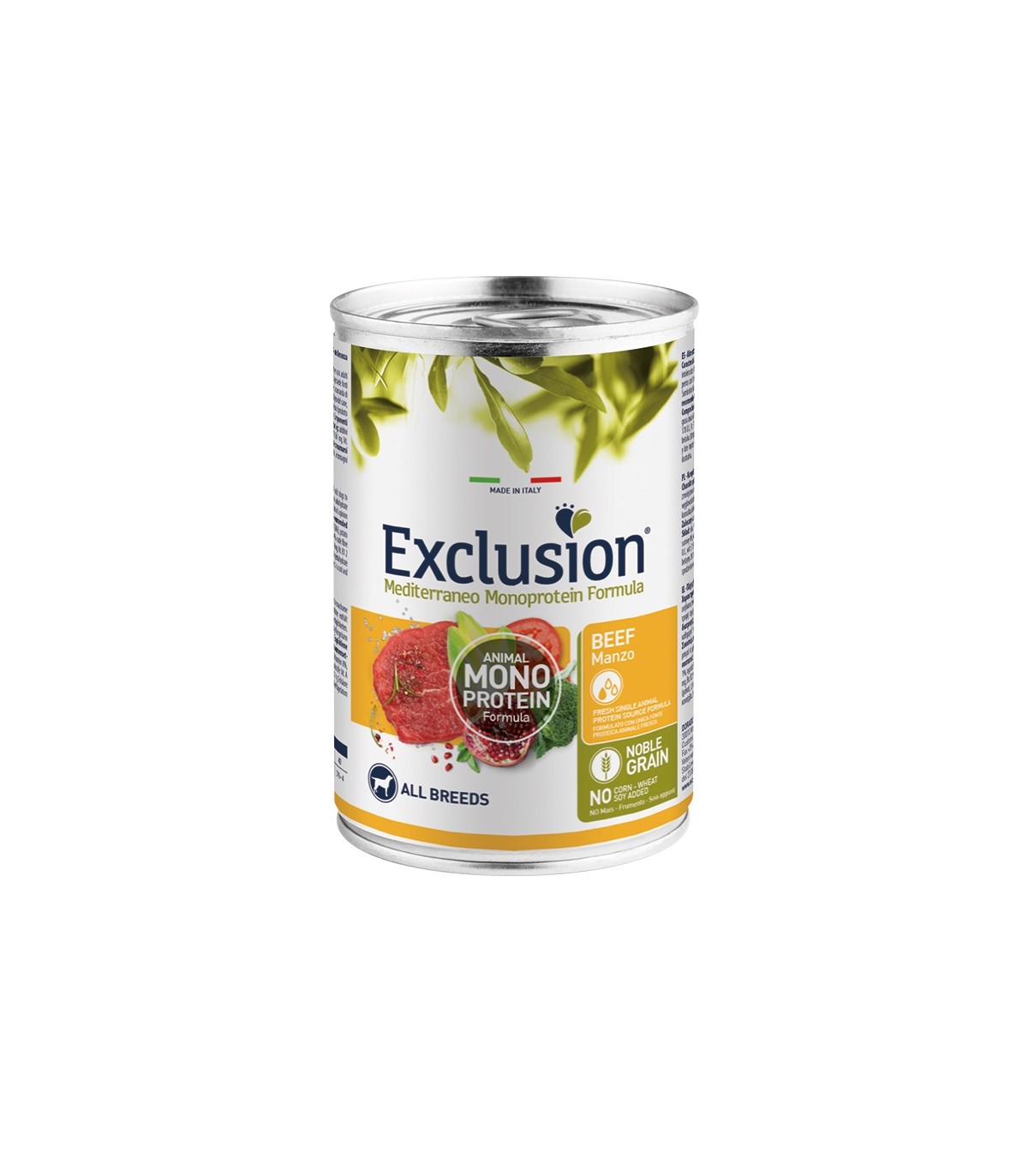 Exclusion Mediterraneo Monoprotein Formula - Noble Grain é un alimento completo e bilanciato formulato con una sola fonte proteica animale disidratata, per una ricetta chiara ed essenziale, e solo un cereale nobile di alta qualità. È preservato con antiossidanti naturali e integrato con Beta-glucani. È realizzato con una innovativa ricetta di Superfood della tradizione Mediterranea: Canapa, Olio d'Oliva, Pomodoro, Melagrana, Broccolo e Cicoria. Senza grasso di pollo, frumento, soia e mais aggiunti.