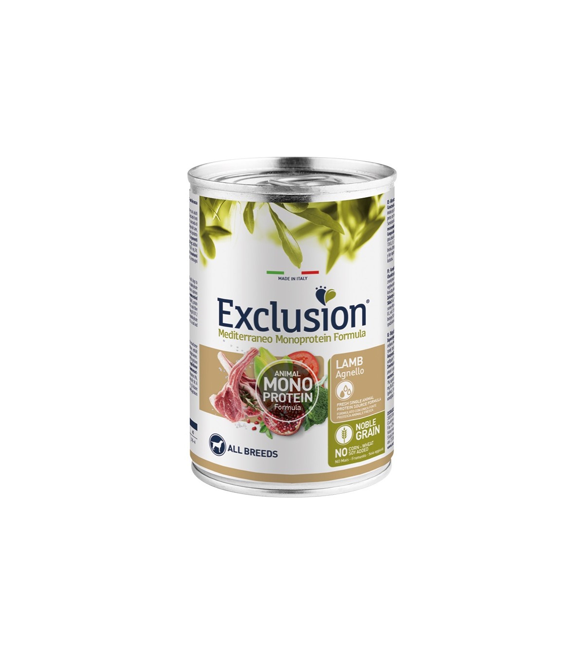 Exclusion Mediterraneo Monoprotein Formula – Noble Grain é un alimento completo e bilanciato formulato con una sola fonte proteica animale disidratata, per una ricetta chiara ed essenziale, e solo un cereale nobile di alta qualità. È preservato con antiossidanti naturali e integrato con Beta-glucani. È realizzato con una innovativa ricetta di Superfood della tradizione Mediterranea: Canapa, Olio d’Oliva, Pomodoro, Melagrana, Broccolo e Cicoria. Senza grasso di pollo, frumento, soia e mais aggiunti.