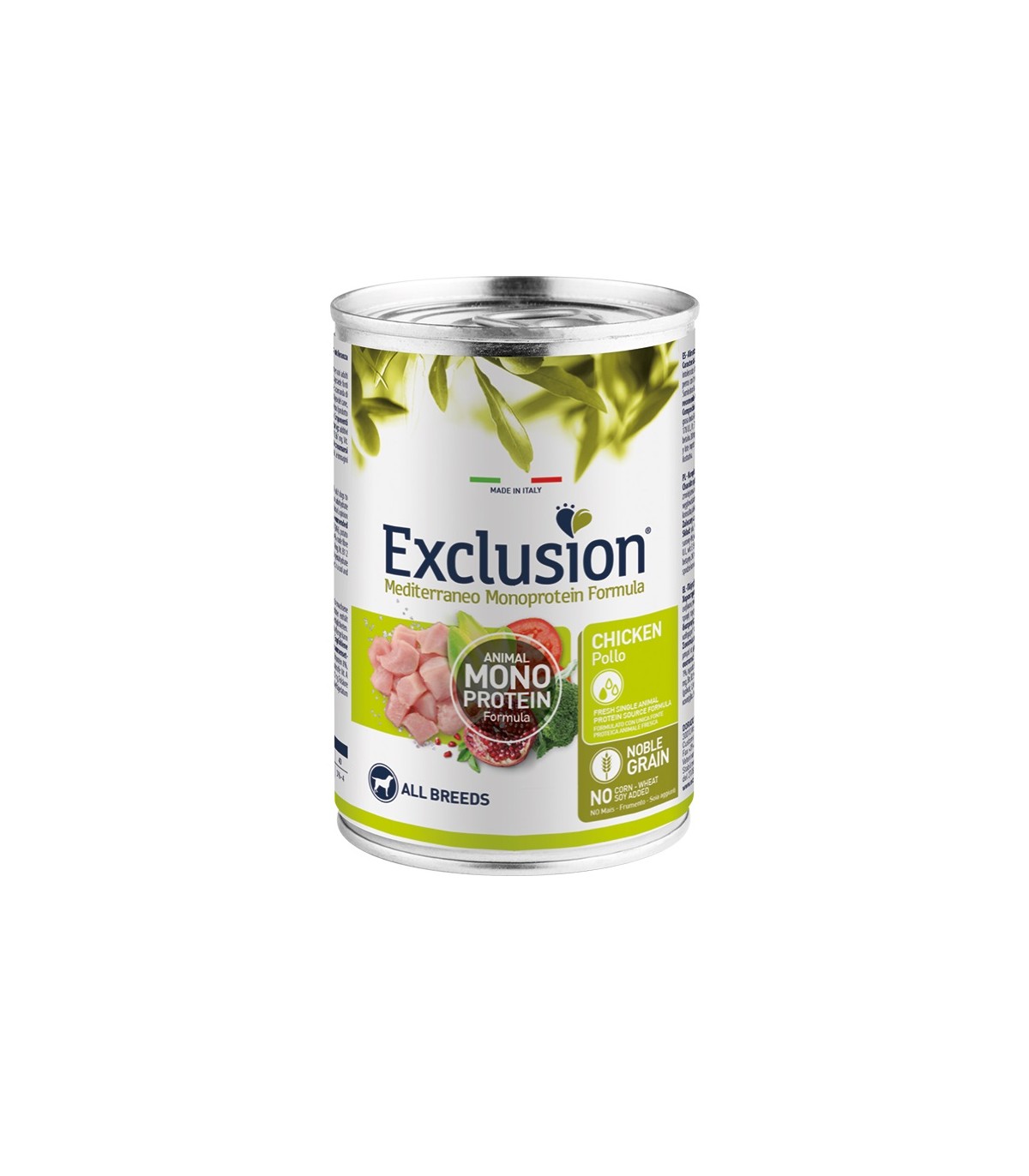 Exclusion Mediterraneo Monoprotein Formula - Noble Grain é un alimento completo e bilanciato formulato con una sola fonte proteica animale disidratata, per una ricetta chiara ed essenziale, e solo un cereale nobile di alta qualità. È preservato con antiossidanti naturali e integrato con Beta-glucani. È realizzato con una innovativa ricetta di Superfood della tradizione Mediterranea: Canapa, Olio d'Oliva, Pomodoro, Melagrana, Broccolo e Cicoria. Senza grasso di pollo, frumento, soia e mais aggiunti.