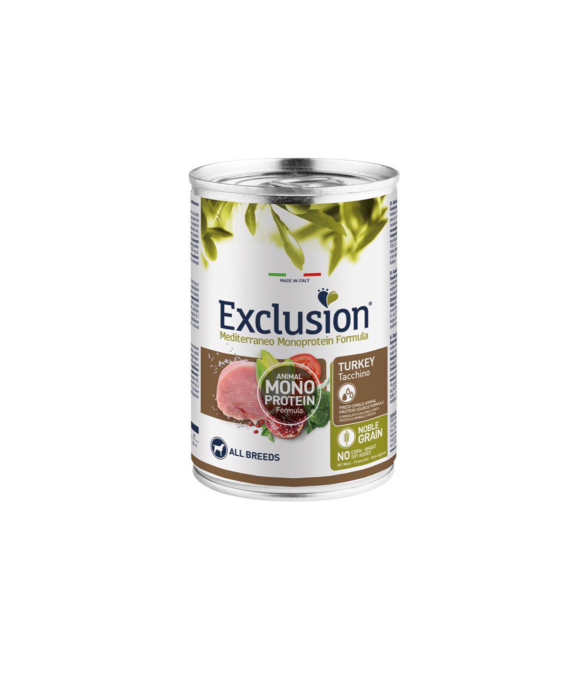 Exclusion Mediterraneo Monoprotein Formula - Noble Grain é un alimento completo e bilanciato formulato con una sola fonte proteica animale disidratata, per una ricetta chiara ed essenziale, e solo un cereale nobile di alta qualità. È preservato con antiossidanti naturali e integrato con Beta-glucani. È realizzato con una innovativa ricetta di Superfood della tradizione Mediterranea: Canapa, Olio d'Oliva, Pomodoro, Melagrana, Broccolo e Cicoria. Senza grasso di pollo, frumento, soia e mais aggiunti.
