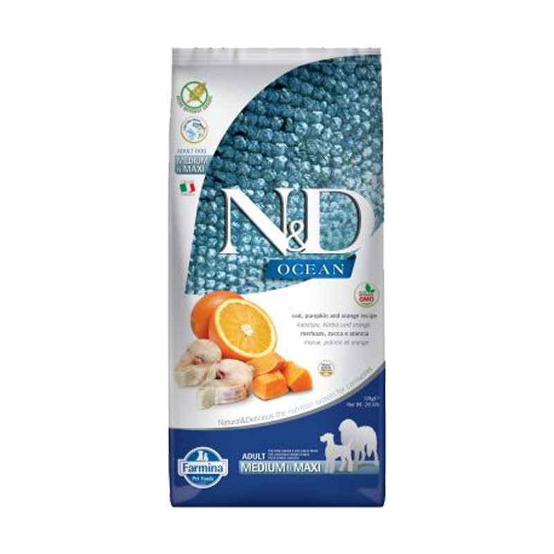 Mangime per cani adulti con elevata percentuale di ingredienti di origine animale pari al 60% e composto, per il restante 40% da frutta, verdura e minerali. N&D Pumpkin Pesce Medium & Maxi è un alimento per cani realizzato con merluzzo, proteina altamente digeribile che rende questo mangime adatto anche per soggetti con intolleranze alimentari o difficoltà digestive.