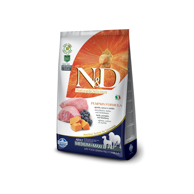 Farmina n&d pumpkin grain free adult medio maxi agnello zucca e mirtillo 12 kg è un alimento completo per cani adulti a base di agnello zucca e mirtillo.
