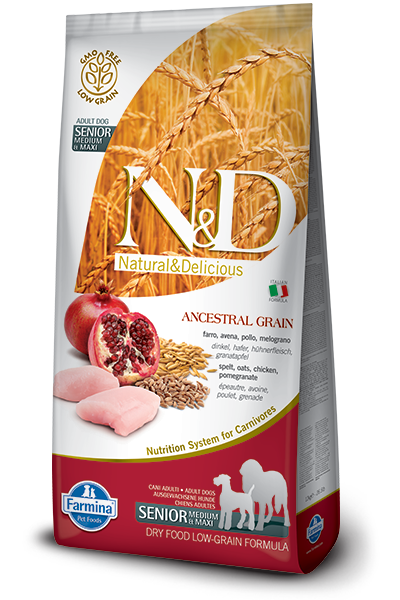 Farmina n&d low grain canna senior medio maxi farro avena pollo e melograno 12 kg è un alimento completo per cani anziani a base di farro, avena, pollo & melograno.